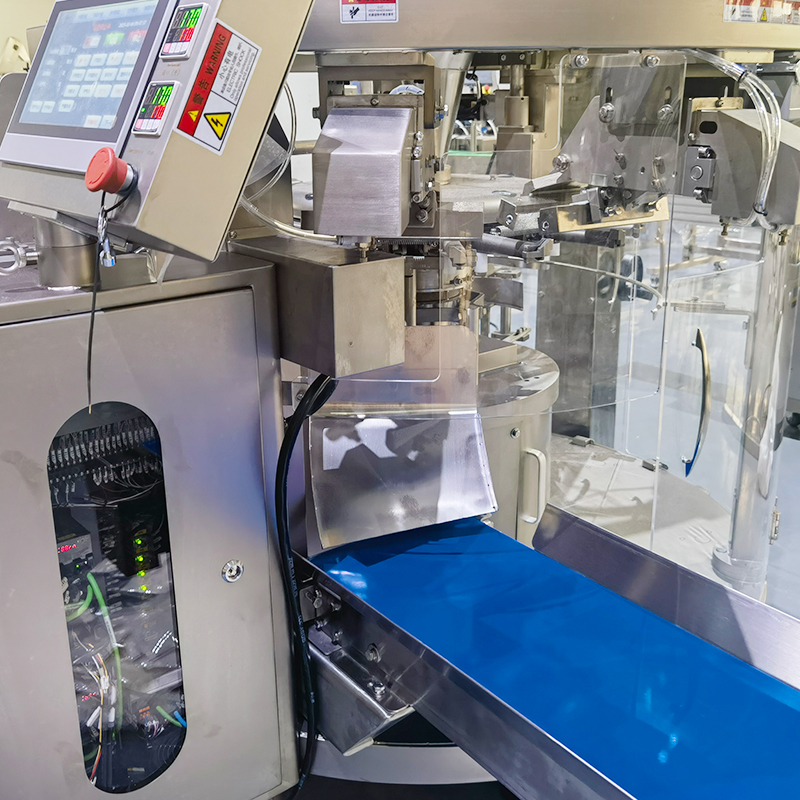 八工位粉劑包裝機的工作方式極為智能靈活,工作人員在經過參數設定后,設備能夠在自動模式下,無縫銜接的配合上下游自動化設備執行包裝任務,給袋式包裝設備的工作方式是操作人員設定好所有工作參數后,由給袋裝置自動抓取輸送至開袋處,經過開袋智能檢測系統,自動將包裝袋呈現出打開的狀態,八工位粉劑包裝機若是檢測到無袋或者不開袋等情況狀態下,下料動作會自動停止。在一切正常的狀態下,物料會按照工作人員設定的包裝重量進行充填,并保證每袋商品充填量的一致性輸出。充填完成后,袋子被輸送至封口工位進行封口處理,隨后經過噴碼、整形等工序。